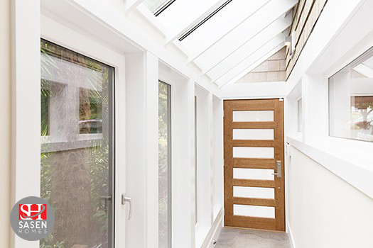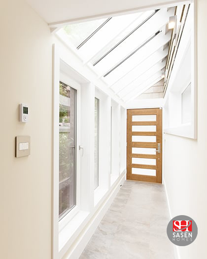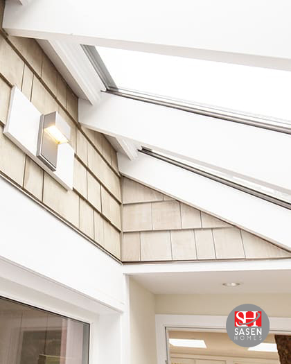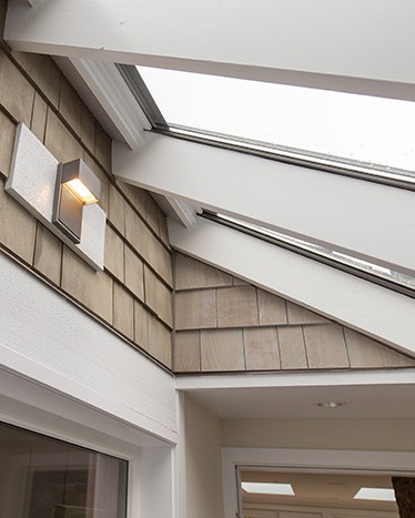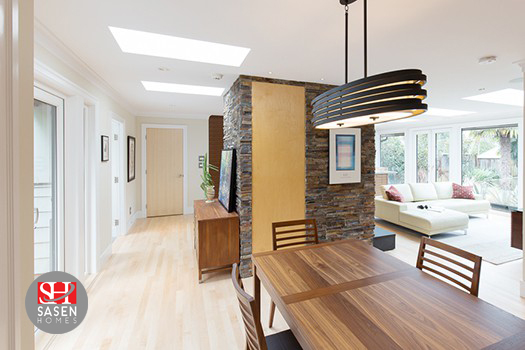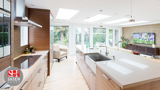 This North Vancouver modern kitchen addition involved adding space to an existing home with unique angles. The added space was needed to create an open kitchen and eating area. To maximize light and circulation, new oversized skylights and a unique custom window surrounding the suspended hood vent were added. The grain matched, quarter cut, black walnut cabinetry exhibits a unique, repeating “stripe-like” pattern.